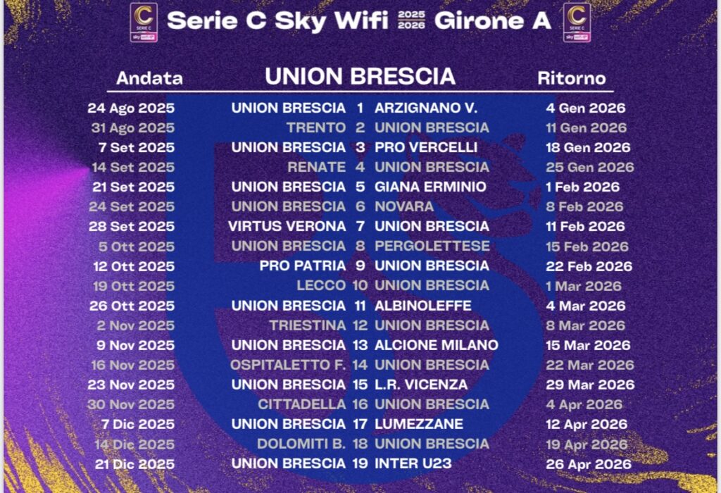 Brescia. La Lega di C ha diramato il calendario. Union Brescia nel girone A avrà un inizio morbido mentre il finale sarà in salita con i due derby con Ospitaletto e Lumezzane e i big match con Vicenza e Cittadella, uno dietro l’altro.